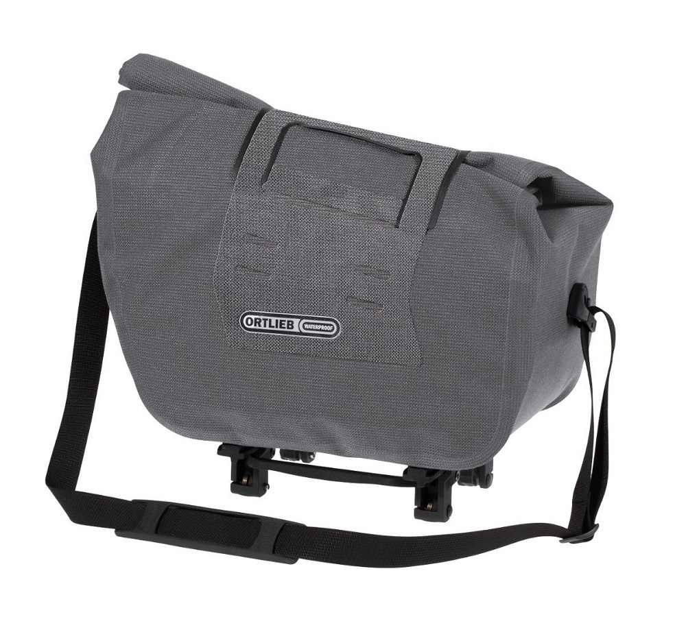 Deze grijze, waterdichte bagagedragertas van kwaliteitsmerk Ortlieb heeft een rolsluiting, een afneembare schouderband en een Top-Lock adapter.